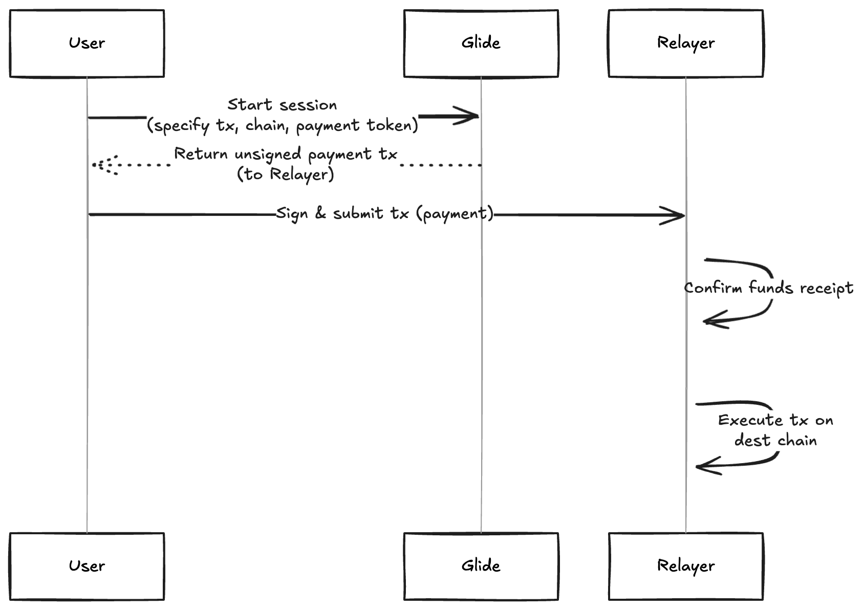 - Relayer Destination Liquidity – After confirmation on the origin chain, Glide (operating as the relayer) provides assets on the destination chain.