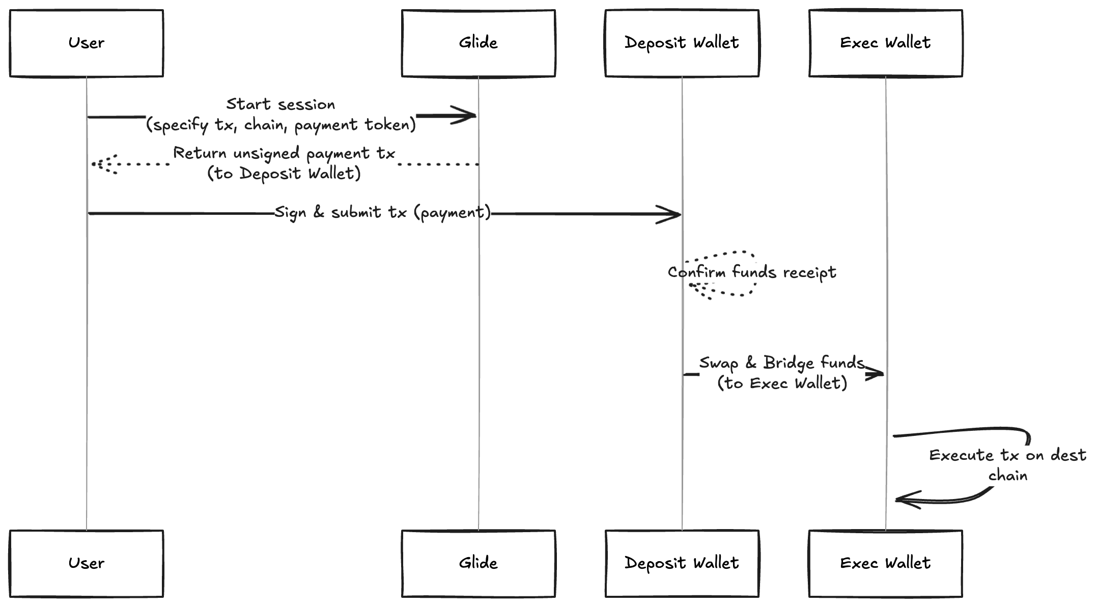 - Deposit Wallet Creation – Glide generates a dedicated deposit wallet for the user. On EVM, this wallet is created using the